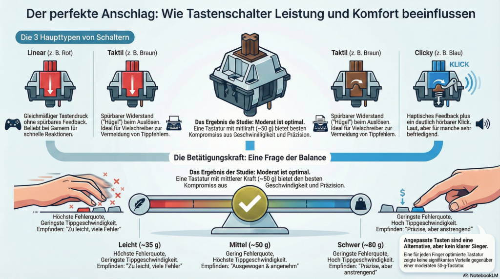 Welche Switches passen, hängt vom Einsatzzweck ab: Schreiben, Gaming oder beides. Entscheidend ist, wie sich die Tastatur anfühlt und wie präzise sie reagiert.